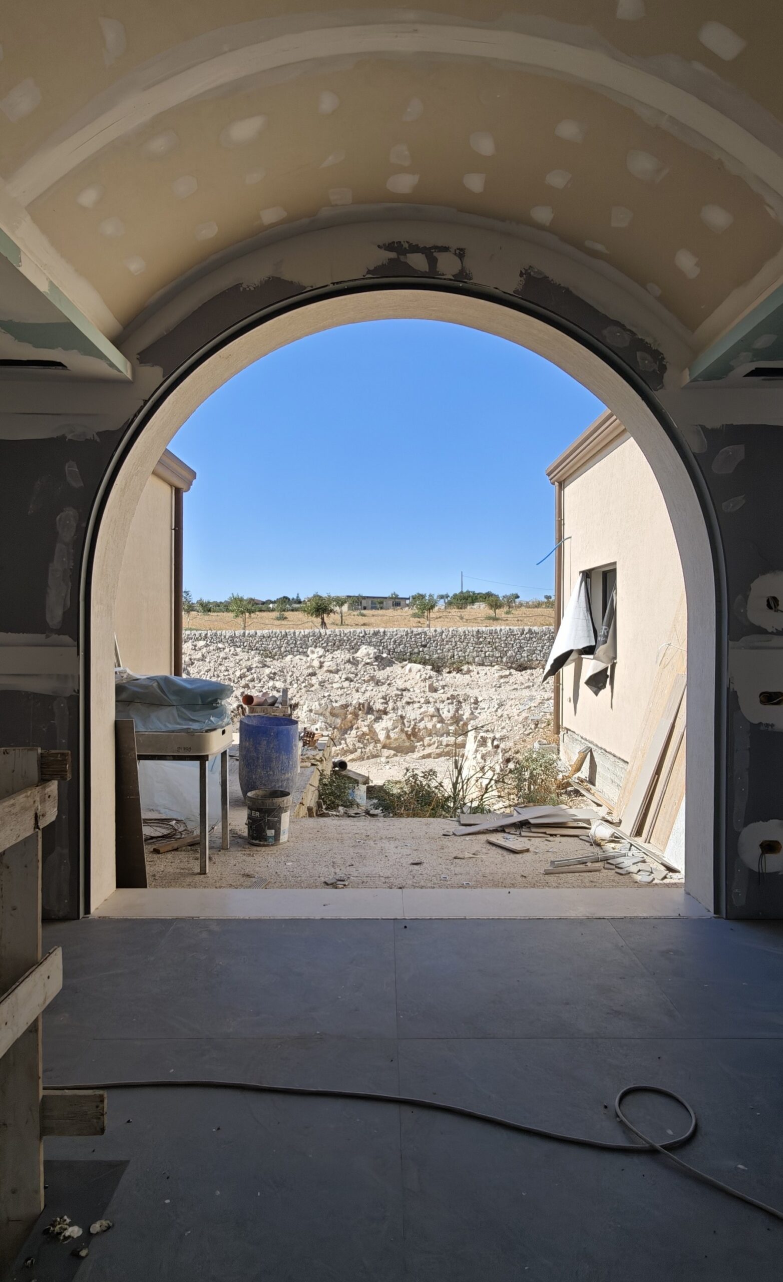 Qui la linea l’abbiamo presa dall’arco: abbiamo rispettato il sogno di chi lo ha progettato, e la soddisfazione di chi lo vuole vivere. Il serramento nascerà discreto, profili sottili, tenuta nascosta, così da tenere fuori calore e polvere della pietra, e far entrare solo il cielo. L’arco diventerà vetro:luce continua, vista intera, casa che respira piano. Tu attraversi, vivi; alla precisione ci pensiamo noi.