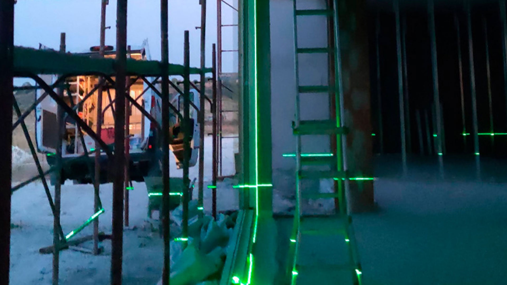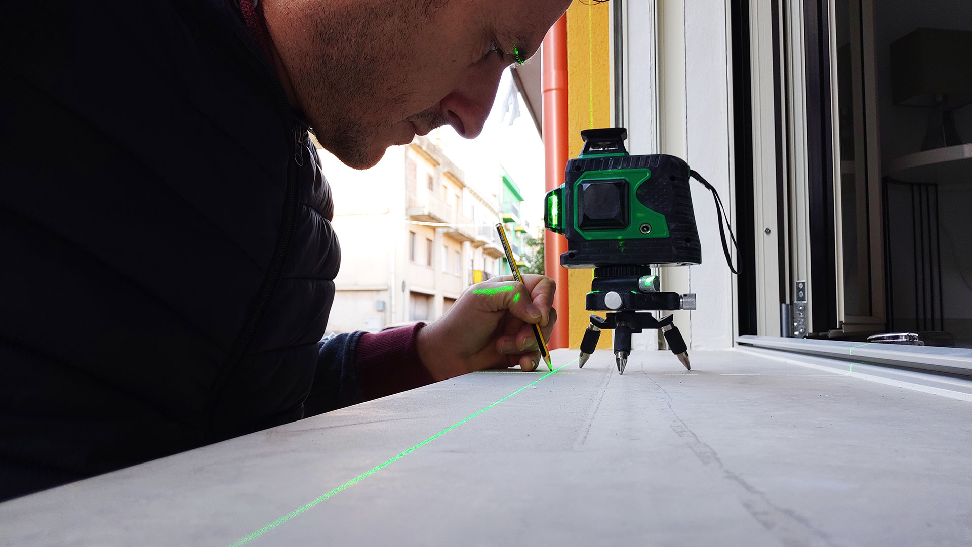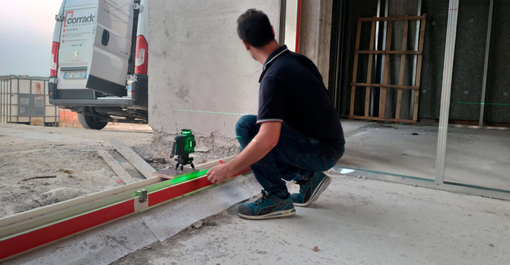 Il cantiere ha il respiro della sera. L’occhio disegna una linea perfetta lungo i binari e scende sulla soglia, come un filo teso che cuce interno ed esterno. La linea verde racconta che tutto è in bolla: spalle, traversi, soglia, è la prova che. La linea del sogno è qui, l’abbiamo messa noi, al millimetro.