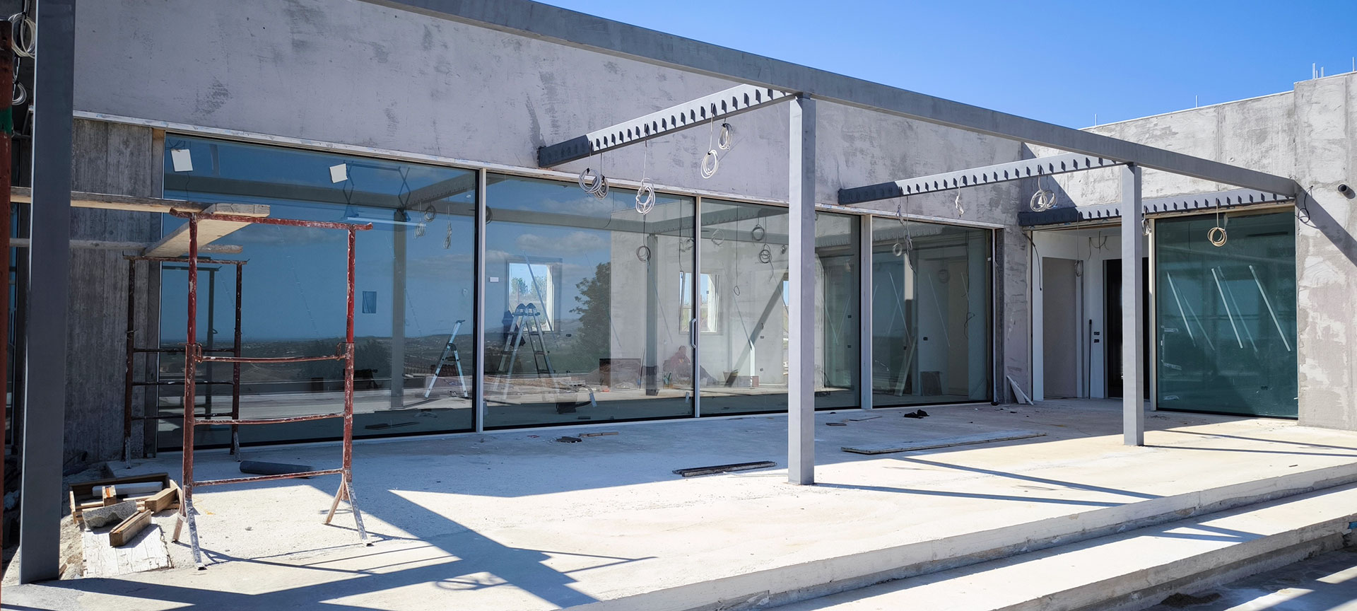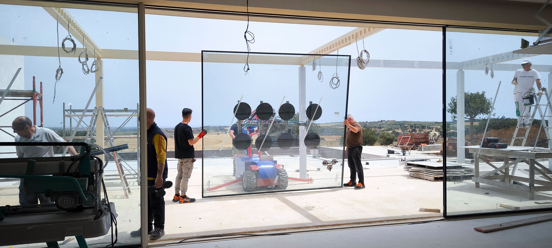 Il cantiere trattiene il fiato. In mezzo al portico, un vetro gigante avanza piano, millimetro su millimetro, tutto coincide e passa tra gli spazi della pergola, come da copione. Tutto pronto per la posa, mentre il paesaggio di colline e ulivi sta fermo, come in una cartolina.