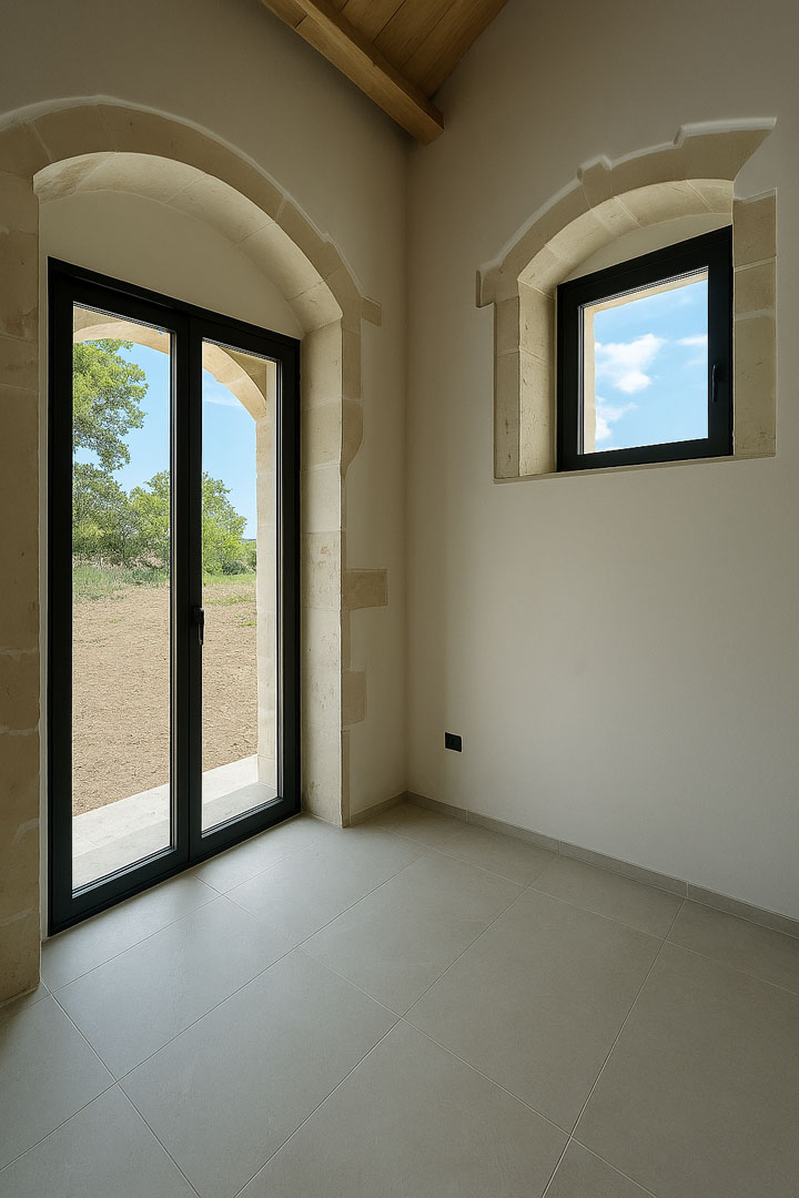 Qui la linea l’abbiamo presa dall’arco: abbiamo rispettato il sogno di chi lo ha progettato, e la soddisfazione di chi lo vuole vivere. Il serramento nascerà discreto, profili sottili, tenuta nascosta, così da tenere fuori calore e polvere della pietra, e far entrare solo il cielo. L’arco diventerà vetro:luce continua, vista intera, casa che respira piano. Tu attraversi, vivi; alla precisione ci pensiamo noi.