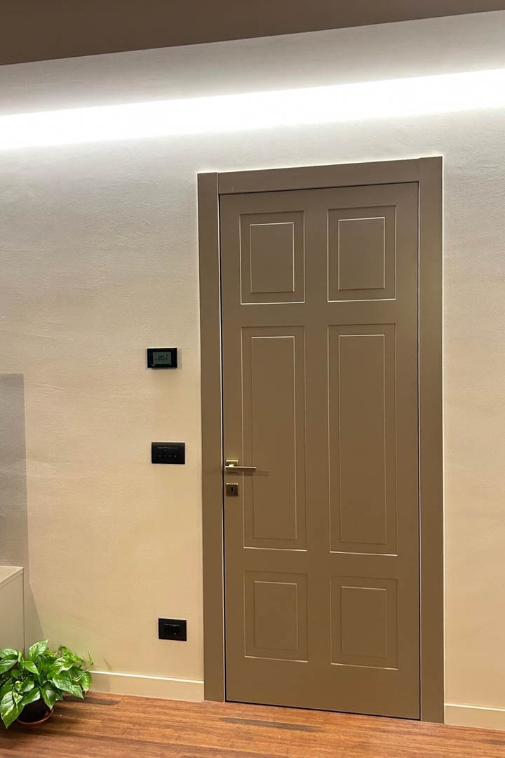 Abbiamo ascoltato i toni della casa, misurato luce e rientri, allineato maniglia e cornice. Posa ordinata, verifiche della chiusura. Ora la bugna tortora arreda senza chiedere spazio. Le porte in legno laccate si citano una volta e poi lavorano, luce LED che le disegna.
