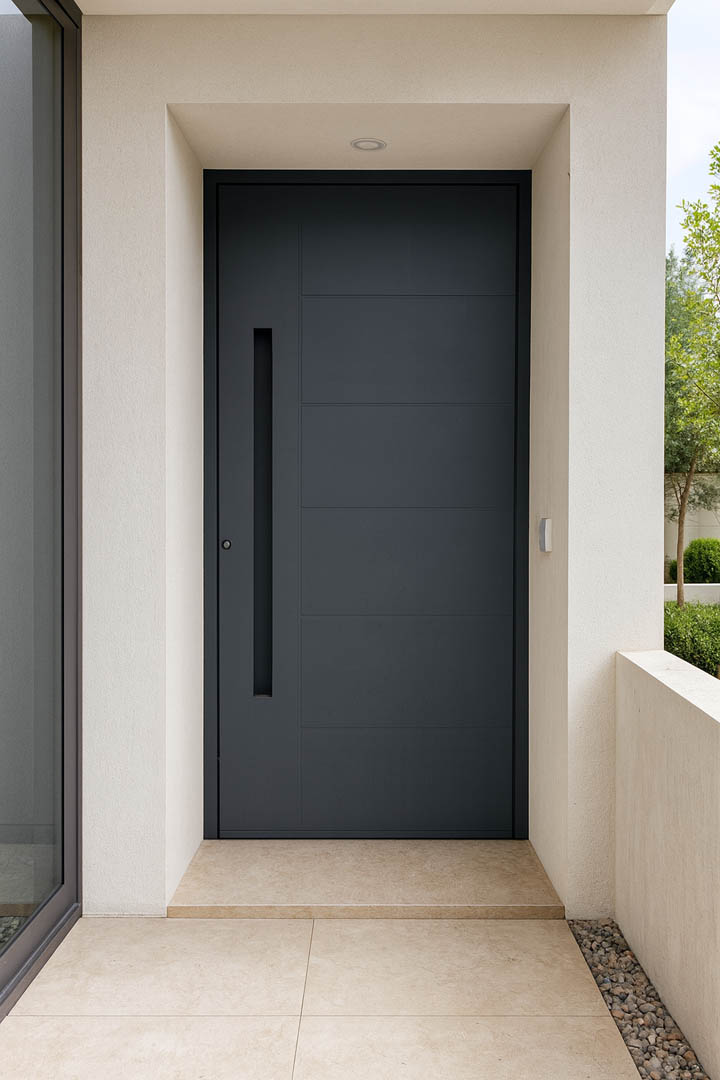 Desiderava effetto e pratica: porta importante, passaggio libero, sguardo accompagnato. Vive altrove, la casa deve orientare in un attimo.