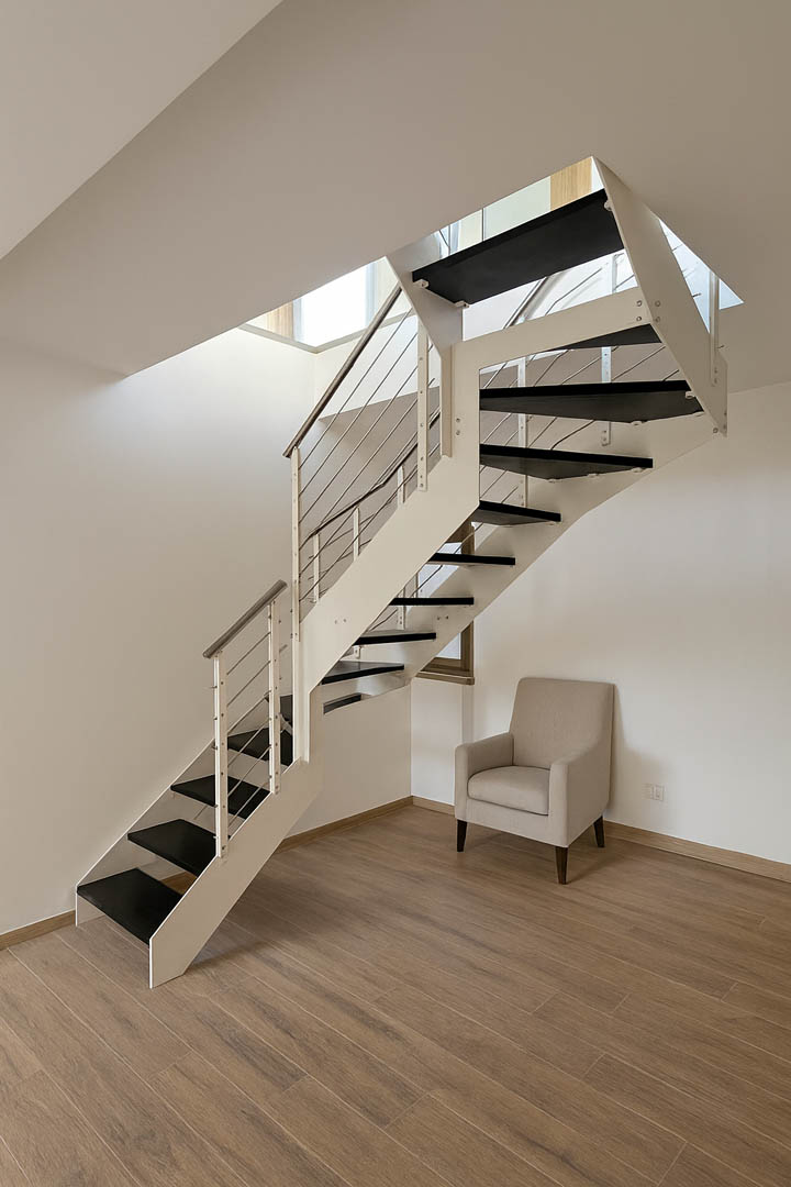 Ora la chiocciola spezzata alleggerisce l’ambiente. La scala in metallo e legno traduce la luce che sale tra i cavi, nero e bianco in equilibrio, pavimento caldo che accoglie.