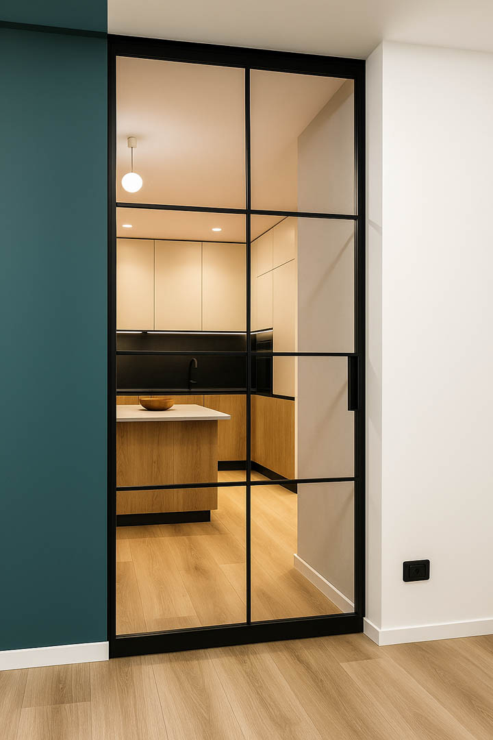 Ora il varco è una cornice: vetro stratificato che illumina, metallo che dialoga con verde e rovere. Le porte scorrevoli in vetro stile industrial si fanno spazio: più luce, meno rumore, movimento naturale.