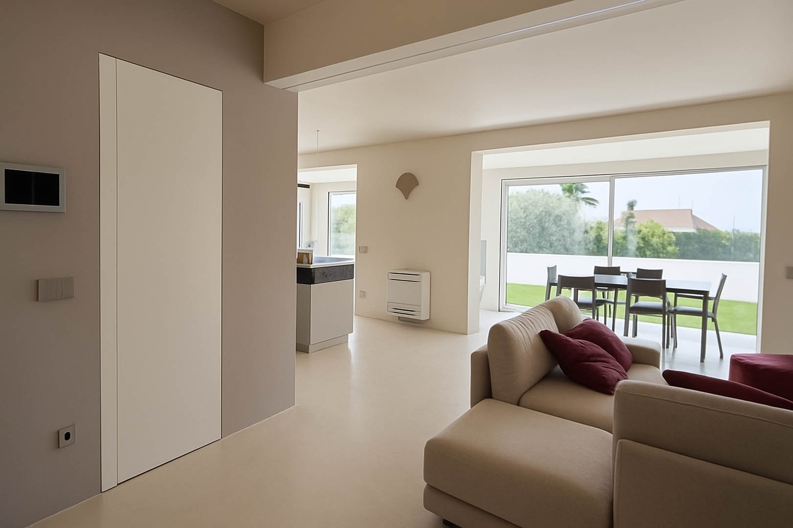 La porta filomuro scompare nella parete. Il serramento appare una sola volta, poi cede la scena alla semplicità: il silenzio quando chiudi. Un richiamo periodico si occupa delle verifiche: estetica salva, zero pensieri.