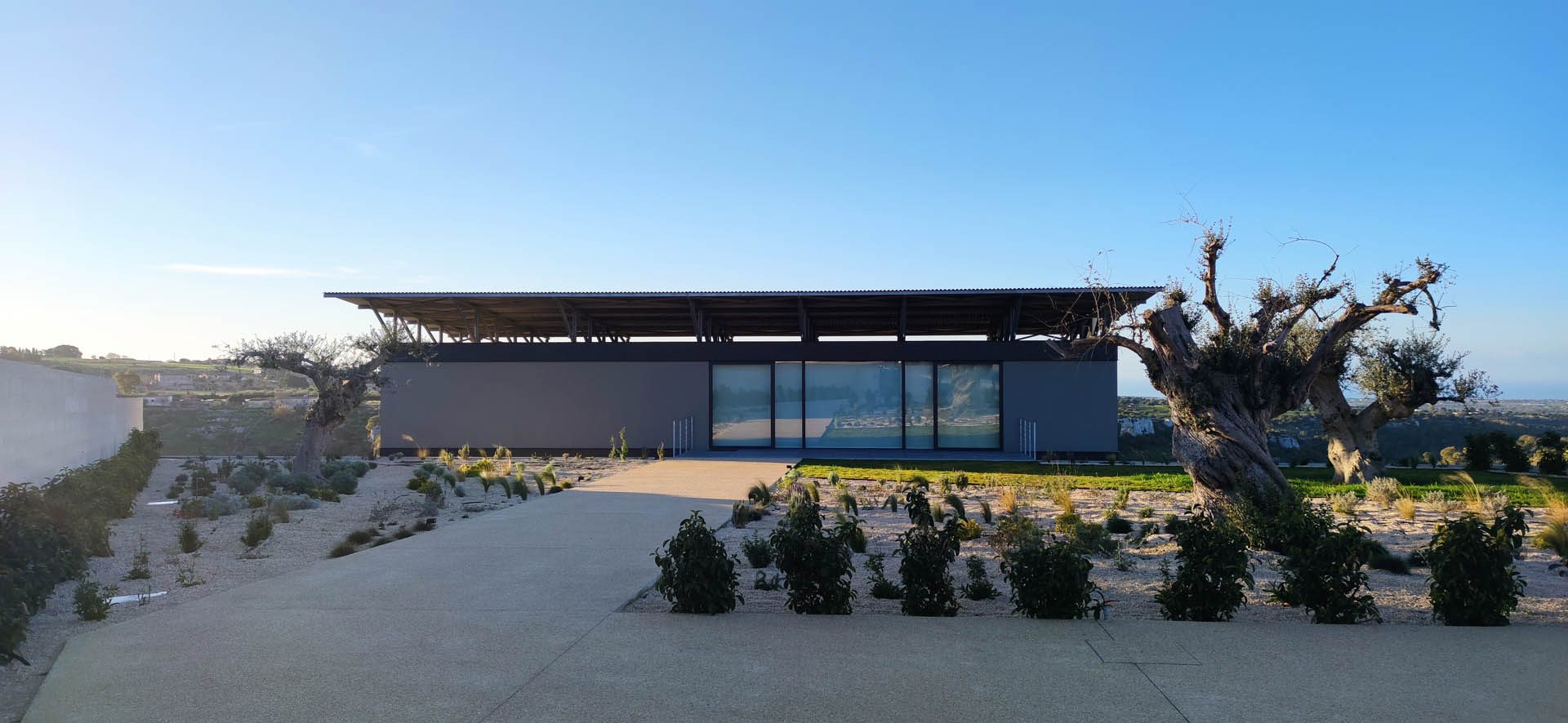 Il cantiere trattiene il fiato. In mezzo al portico, un vetro gigante avanza piano, millimetro su millimetro, tutto coincide e passa tra gli spazi della pergola, come da copione. Tutto pronto per la posa, mentre il paesaggio di colline e ulivi sta fermo, come in una cartolina.